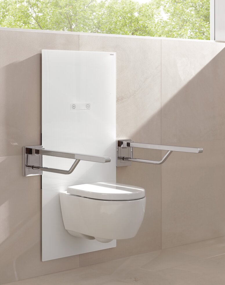 • Stützklappgriffe: Sie bieten Stabilität beim Umsetzen und Aufrichten – ein zentraler Aspekt in einem rollstuhlgerechten Bad. HEWI Stützklappgriffe sind ergonomisch geformt, sicher greifbar und besonders belastbar. Der HEWI Stützklappgriff Duo verfügt über eine zweite Griffebene – ideal zum seitlichen Eindrehen und Umsetzen. Zusatzfunktionen wie ein integrierter WC-Papierhalter oder eine Spülauslösung lassen sich direkt am Griff anbringen.
