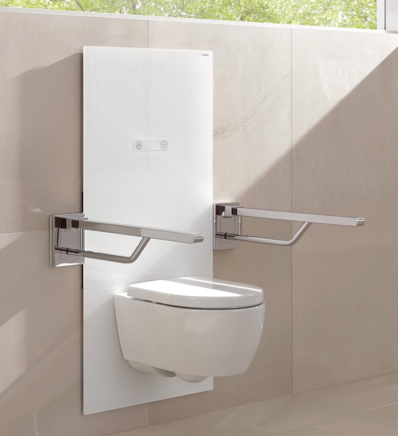 Es ist also sehr gut und wichtig, sich an der DIN-Norm zu orientieren, wenn es um die Montagehöhe eines Stützklappgriffs geht. Allerdings handelt es sich dabei um durchschnittliche Angaben, die Menschen, die größer oder kleiner sind als der Durchschnitt, ausschließen. Auch wenn es bei WCs und Waschtischen inzwischen höhenverstellbare Alternativen gibt – etwa die S 50 Module von HEWI – so ist ein höhenverstellbarer Stützklappgriff bislang eine Seltenheit. HEWI hat hierfür eine Lösung: Eine höhenverstellbare Platte, die mit verschiedenen Stützklappgriffen von HEWI kompatibel ist.