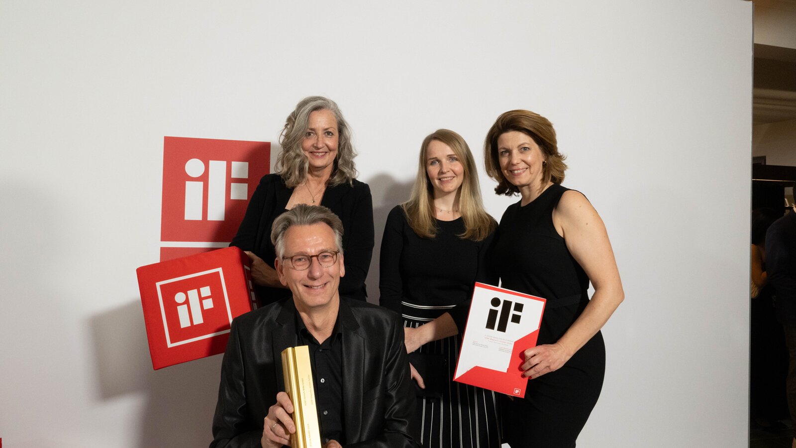 Thorsten Stute (Geschäftsführer HEWI), Christiane Küper (Bereichsleitung Brand + Sales), Ann-Kristin Block (Leitung Marketing) und Christina Marpe-Engelhardt (Assistenz der Geschäftsführung) bei der Preisverleihung der iF Design Awards 2024 (v.l.n.r.).