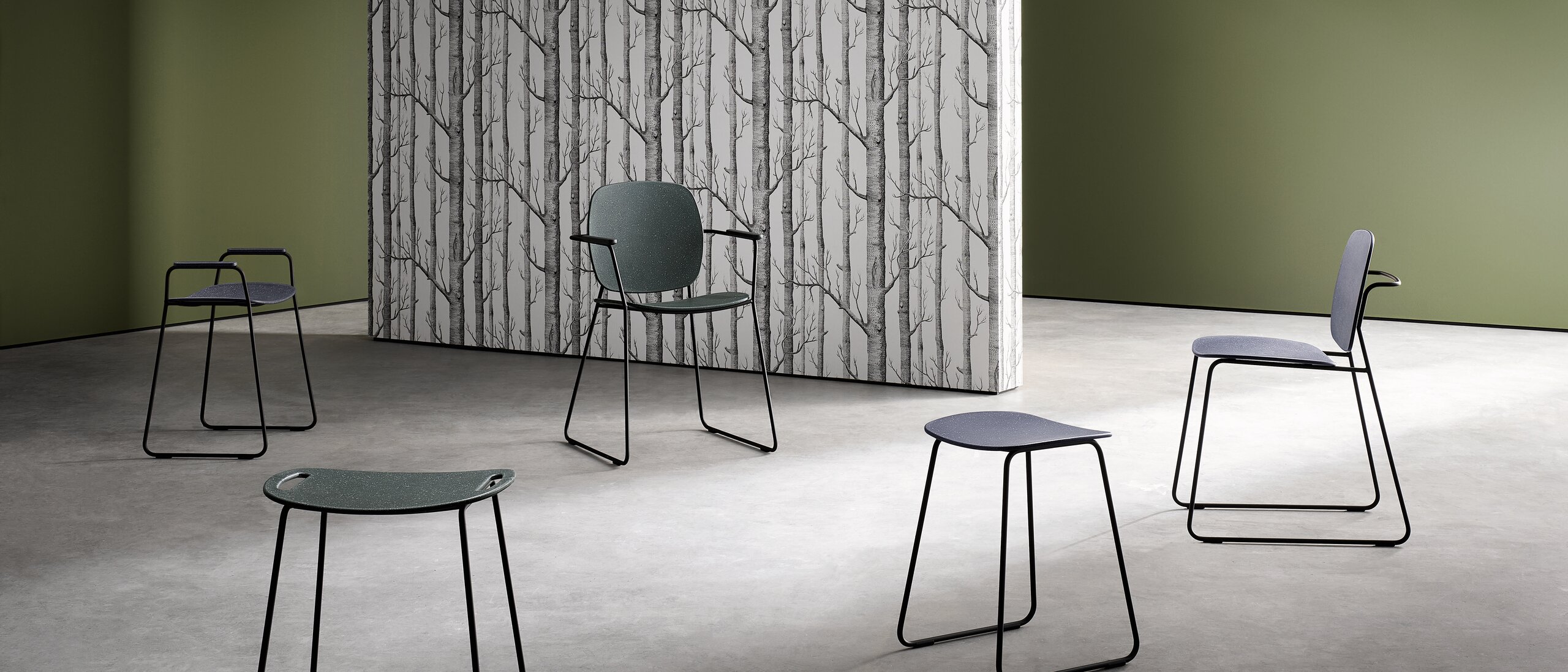Die Hocker und Stühle der nachhaltigen Re-Sitzfamilie von HEWI zum Beispiel bestehen aus Post-Industrial Rezyklat und sind ein Statement für bestes Ecodesign. In den naturnahen Farben Waldgrün und Dunkles Granitgrau überzeugt die Re-Sitzfamilie sowohl haptisch als auch optisch mit ihrem außergewöhnlichen Look. Das Besondere dabei: Die Re-Sitzfamilie fertigt HEWI aus rezykliertem Polypropylen und rezykliertem Polyamid. Letzteres stammt aus der eigenen Produktion, während Ersteres von einem regional ansässigen Anbieter bezogen wird, was wiederum der Lieferkette zugutekommt. Dieses nachhaltige Vorgehen bedeutet aber nicht, dass das Design zu kurz kommt. Ganz im Gegenteil: Jeder Hocker ist ein Unikat, da die verwendeten Materialien einen unterschiedlichen Schmelzpunkt haben, wodurch sich im Spritzgussprozess in der Oberfläche eine melierte Struktur ergibt.