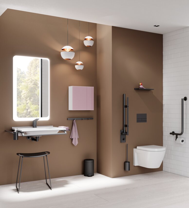 Neben der Funktionalität trägt auch die Gestaltung zur Barrierefreiheit bei. Klare Farbkontraste zwischen Boden, Wand und Sanitärobjekten erleichtern die Orientierung und helfen insbesondere Menschen mit eingeschränktem Sehvermögen. Beispielsweise kann ein dunkler Boden in Kombination mit hellen Wänden und farblich abgesetzten Waschtischen und WCs eine klare visuelle Struktur schaffen. Auch kontrastreiche Armaturen und Griffe erhöhen die Bedienfreundlichkeit und sorgen für ein Plus an Sicherheit im Alltag.