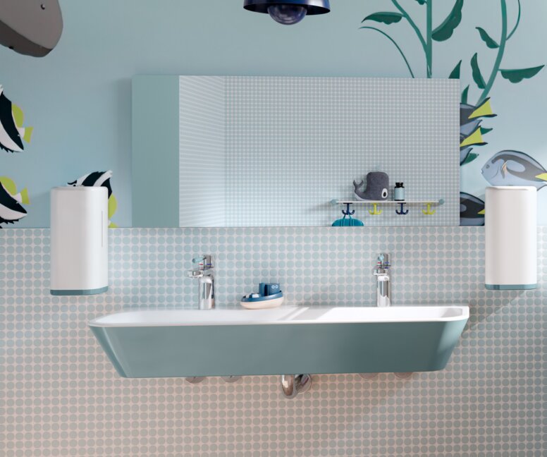 Farbige Waschtische und kindgerechte Motive regen zum Mitmachen an und machen Hygiene zum positiven Ritual.
