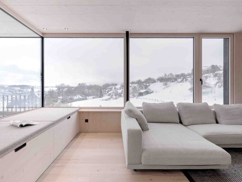 Das architektonische Konzept basiert auf dem Dialog der Materialien. Sichtbeton als Fundament ist dauerhaft, lasttragend und robust. Dem gegenüber steht das warme Holz der oberen Geschosse, das für Leichtigkeit, Offenheit und Lebensnähe steht. „Diese Gegensätze sind kein Widerspruch, sondern die eigentliche Stärke des Hauses“, betont Schönauer. In diesem Spannungsfeld entfaltet sich eine Architektur, die sowohl Festigkeit als auch Transparenz ausstrahlt. Großformatige Glasflächen, präzise gesetzte Durchblicke und ein Sitzfenster mit Panoramablick verweben den Innenraum eng mit der Landschaft. Innen und Außen bilden ein fließendes Kontinuum.