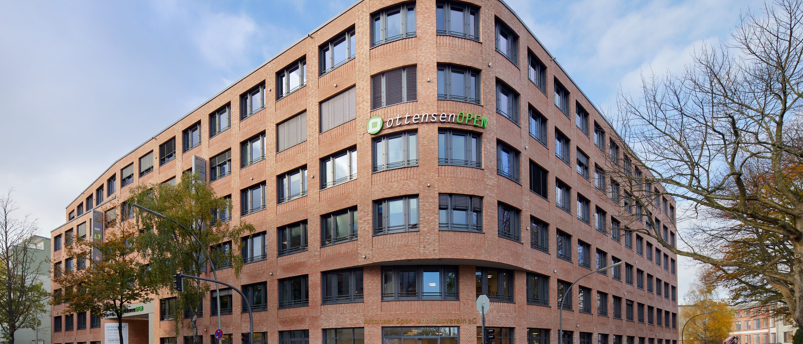 Das ottensenOpen strahlt eine Mischung aus Ruhe und Spannung aus. Die abwechslungsreiche und spannungsvolle Kubatur des Gebäudes mit ihren Rücksprüngen und Rundungen kombinierten die Architekten mit einer regelmäßigen und ruhigen Fassadenaufteilung. Gleichzeitig fügt sich das Bürogebäude äußerst harmonisch in die umgebende Architektur Ottensens ein, die vorwiegend aus Altbauten besteht. Das sechsgeschossige Gebäude greift die Bestandhöhen der benachbarten Häuser auf. Um die optische Integration in die Bestandsbebauung zusätzlich zu verbessern, schufen die Architekten einen Rücksprung im fünften Obergeschoss in Höhe der Traufkanten der anschließenden Gebäude. Auf der Rückseite des ottensenOpen bildet der fünfgeschossige Baukörper die moderne Form eines Gewerbehofs. Der Innenhof wird durch eine Durchfahrt von der Barnerstraße aus erreicht.