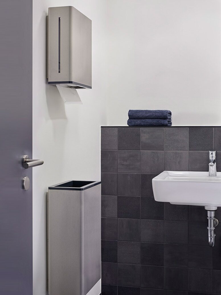 Die Architekten wählten für die barrierefreien Sanitärräume die Serie 805 von HEWI. Das reduzierte Design von Serie 805 ermöglicht eine klare Rauminszenierung. Bis ins kleinste Detail zeigt sich bei dieser Serie, dass gutes Design und intelligente Funktionen eine Einheit bilden. So ist der Funktionsbereich der Spendersysteme aus hochwertigem Polyamid farbig abgesetzt.