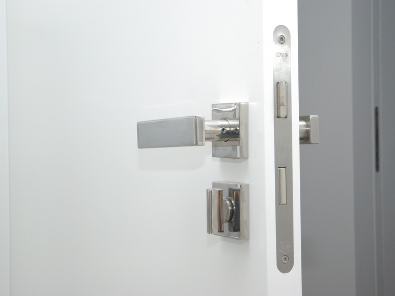 An den Türen und Fenstern wurde die ausdrucksstarke Beschlagsserie 180 in der Edelstahlvollversion eingesetzt. Die Beschläge werden aus massivem Edelstahl gefräst und erhalten so ihre eigenständige Kontur. Das Designkonzept der Serie 180, das auf einem Rechteck basiert, nimmt Bezug auf den quaderförmigen Grundriss des Gebäudes. Die Kombination mit quadratischen Rosetten unterstreicht die geometrische Formensprache der Türdrücker.