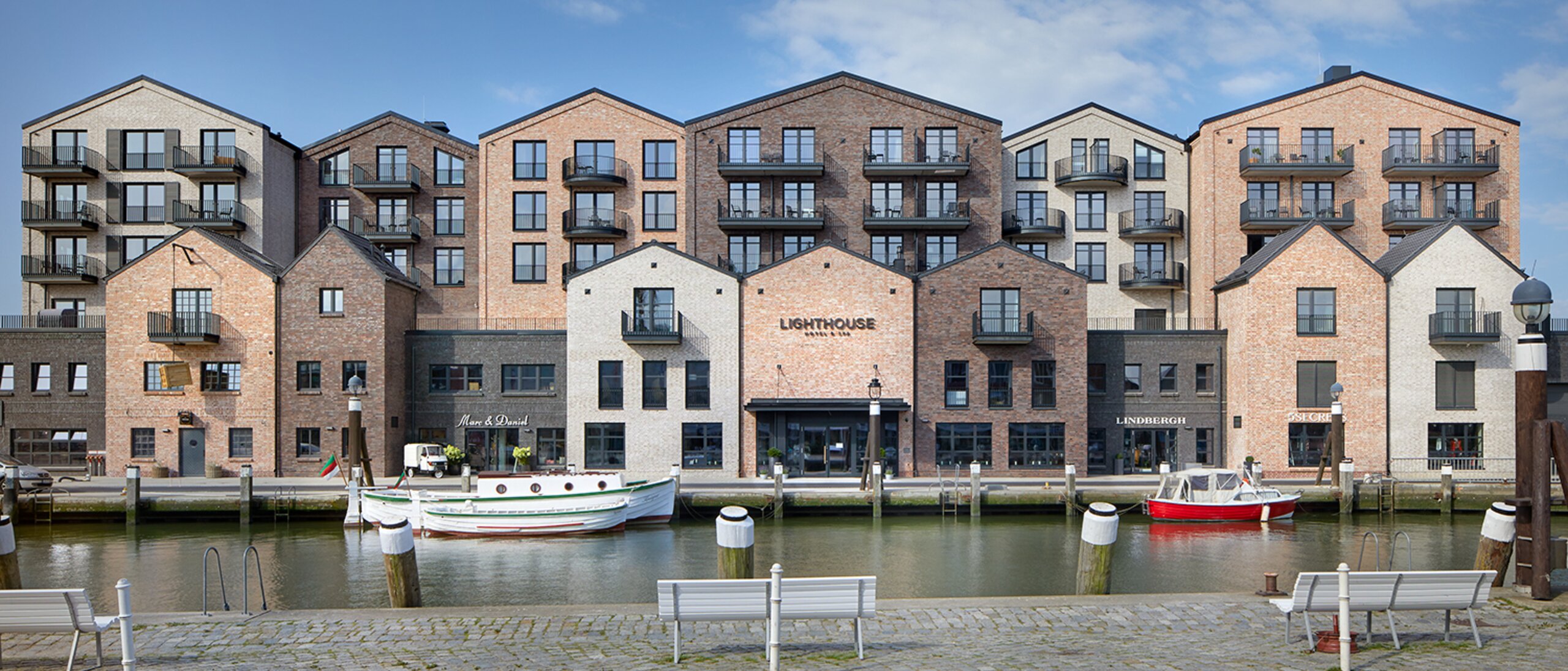 Le grand volume du bâtiment a été divisé en petites structures individuelles et transmet un charme portuaire typique de l'Allemagne du Nord. Pour l'observateur, le Lighthouse Hotel & Spa ressemble donc à un ensemble de bâtiments différents qui, outre l'hôtel, abrite également trois restaurants, des salles de conférence, une épicerie fine, deux boutiques et un pub portuaire.
