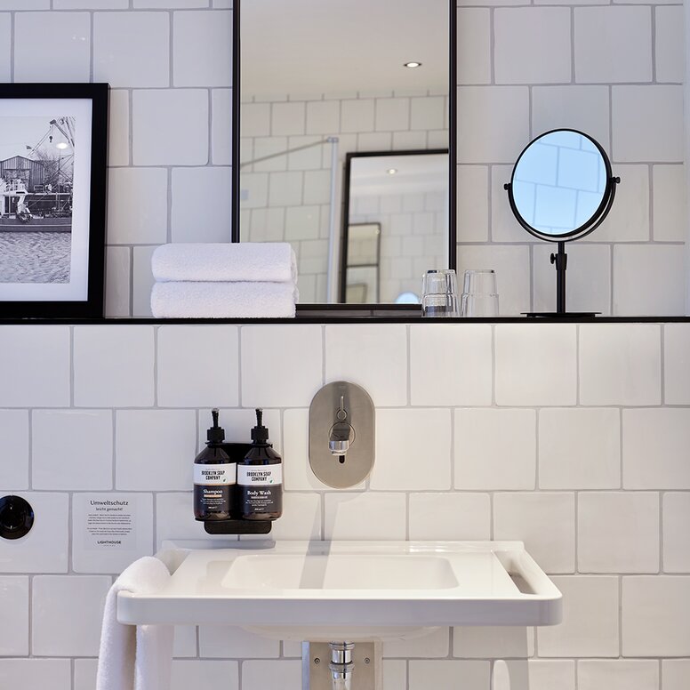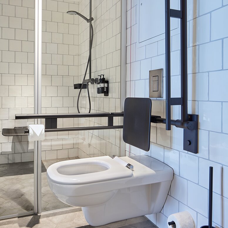 Les éléments de construction et de design noirs sont comme un fil rouge dans la conception de l'hôtel. Les solutions du Système 900 de HEWI s'intègrent harmonieusement dans les salles de bains d'hôtel et les espaces sanitaires sans obstacle.