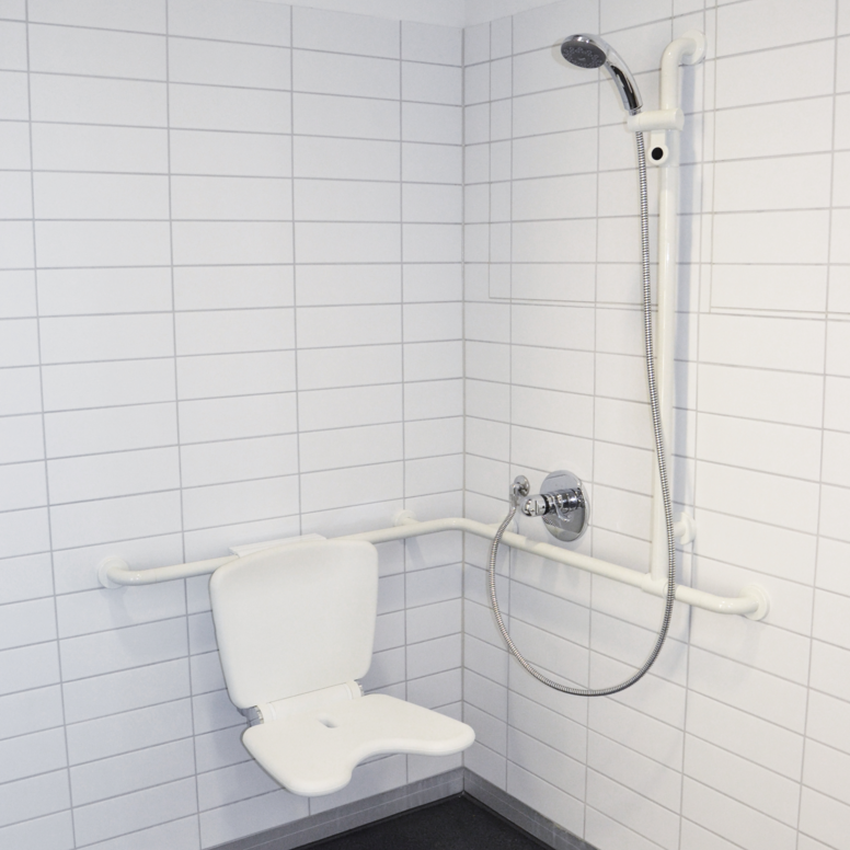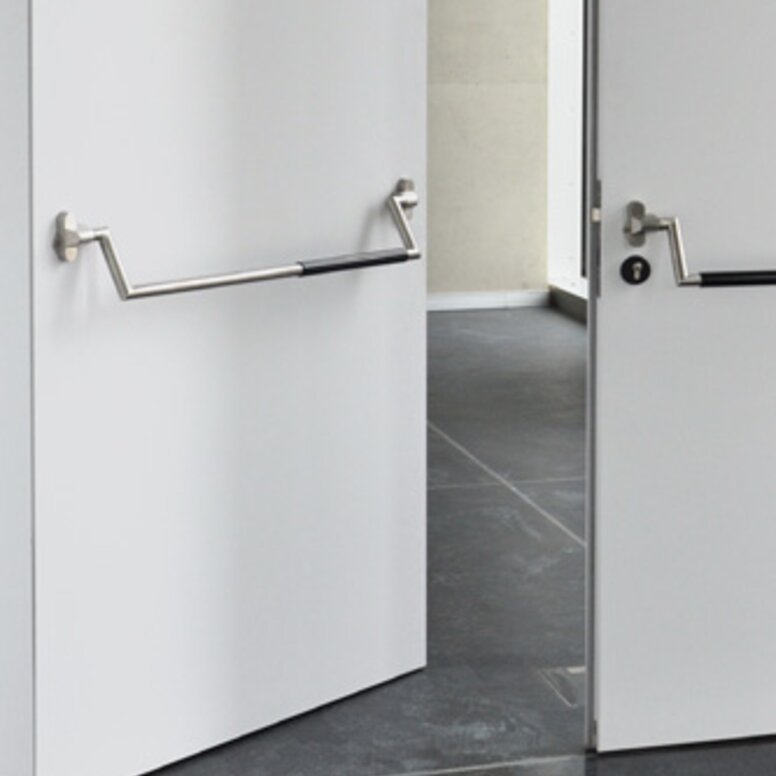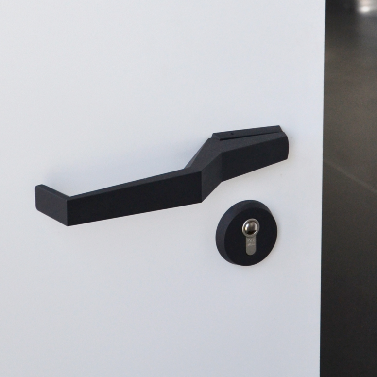 A l'opposé, le complexe administratif et de séminaires est conçu de manière transparente avec une façade en verre et offre un maximum de souplesse d'utilisation et de mise en réseau, par exemple grâce à une technologie décentralisée. Le contraste entre ouvert et fermé se reflète dans les contrastes noir et blanc choisis. Dans la zone des laboratoires, les murs sont noirs et les sols sont en résine époxy blanche. En revanche, dans l'espace séminaire, les murs sont blancs et les sols sont recouverts de tapis noir. La forme dynamique du bâtiment administratif se reflète dans la forme fluide des poignées de porte. La série 120 en noir a été utilisée ici