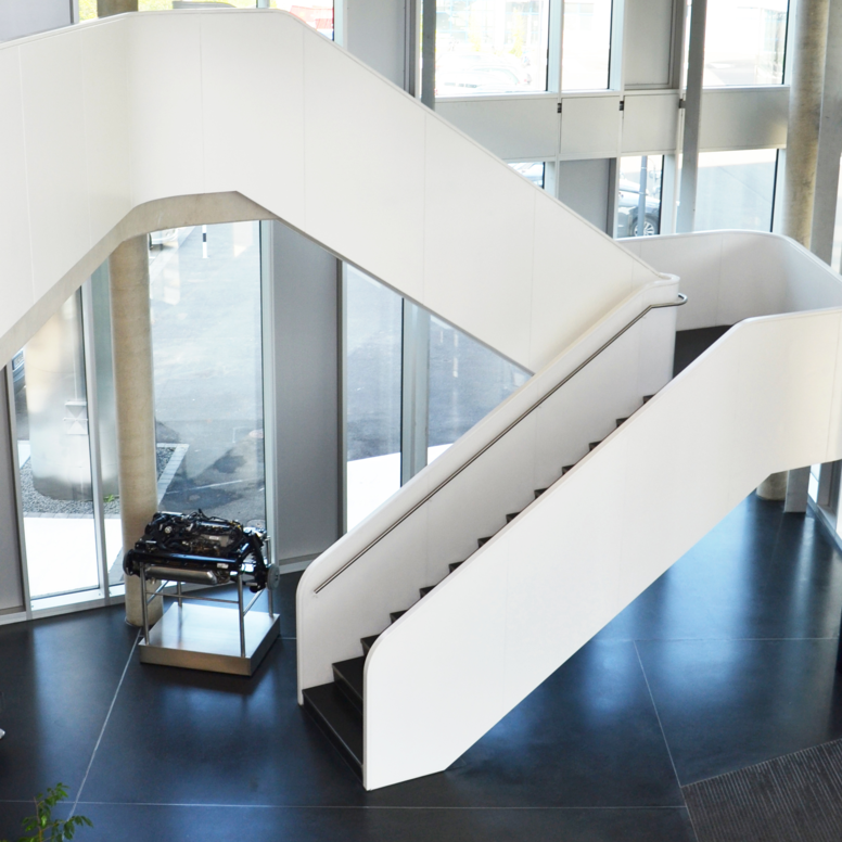 Le développement de nouveaux moteurs devient de plus en plus complexe et nécessite des équipes de développement multidisciplinaires. Au sein du CMP (Centre de propulsion mobile), 16 instituts de l'Université technique (RWTH) ont donc uni leurs forces dans la Forckenbeckstraße à Aix-la-Chapelle. Des recherches interdisciplinaires y sont menées, par exemple sur la réduction des émissions de CO2 des voitures particulières et des véhicules commerciaux. Le nouveau centre de recherche a été conçu par le cabinet d'architectes Lepel & Lepel Architektur. Le CMP est conçu de manière à ce que les bureaux et les laboratoires puissent être utilisés de manière flexible. Il se compose de deux sections de bâtiment : une aile contient un laboratoire, qui comprend des bancs d'essai de moteurs, des ateliers et des vestiaires, ainsi que des douches pour les mécaniciens. L'autre partie du bâtiment est un complexe administratif et de séminaires. Les bancs d'essai de moteurs dans le bâtiment du laboratoire posent un défi particulier, car ils sont soumis à des exigences de sécurité particulièrement élevées. Entre autres choses, des exigences particulièrement élevées en matière de protection contre l'incendie doivent être respectées ici. Par exemple, les prototypes qui sont soumis au secret sont testés sur les bancs d'essai des moteurs. Cette partie du bâtiment est donc conçue comme un bloc autonome
