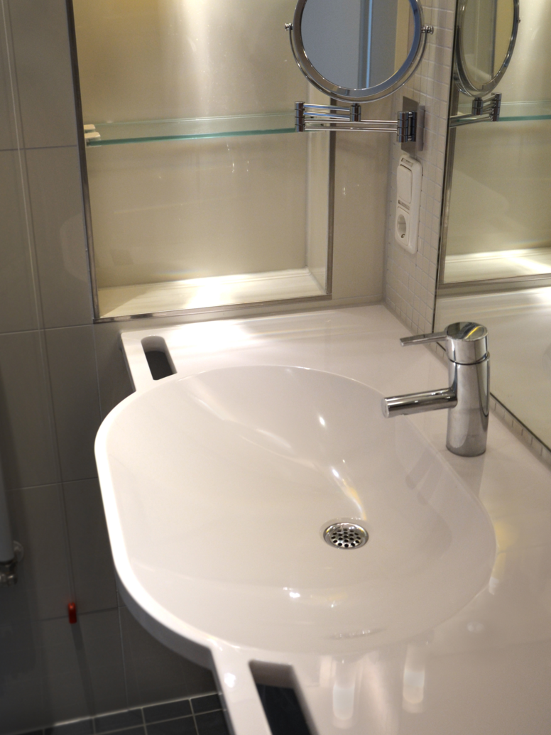 L'ameublement de haute qualité donne également aux salles de bains de la zone de services optionnels une atmosphère de bien-être. Les produits sans barrières s'intègrent dans le design. Le lavabo accessible peut être utilisé aussi bien debout qu'assis confortablement et n'est pas immédiatement reconnaissable comme un produit sans obstacle. Les poignées intégrées assurent une bonne prise en main et facilitent la verticalisation. L'étagère généreuse offre beaucoup d'espace pour les ustensiles de toilette. Un trop-plein a été délibérément omis du lavabo.Cette surface et une surface non poreuse facilitent le nettoyage et augmentent l'hygiène.