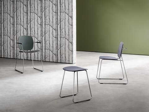 La famille de sièges Re de HEWI, fabriqués à partir de matières recyclées post-industrielles, en est un exemple. Les tabourets et les chaises de salle de bain séduisent non seulement par leurs matériaux respectueux du climat, mais aussi par leur design intemporel. Disponibles dans des tons naturels comme le vert forêt et le gris granit foncé, combinés à des châssis filigranes en tubes ronds noirs ou chromés, ils s'intègrent harmonieusement dans les salles de bains modernes des hôtels et donnent en même temps le ton d'un design d'intérieur respectueux de l'environnement.