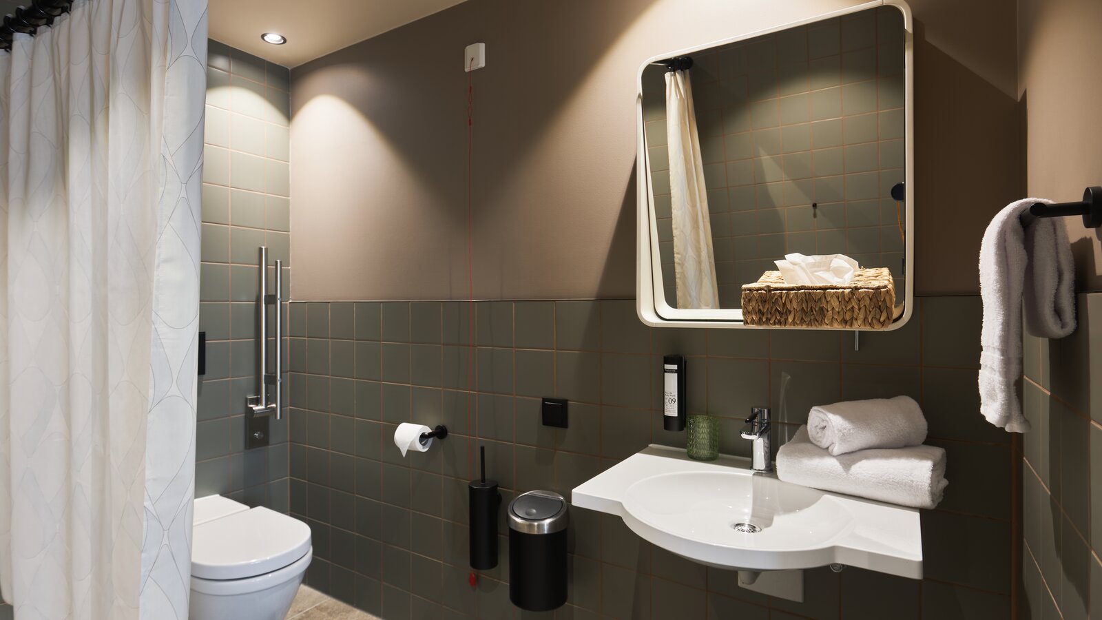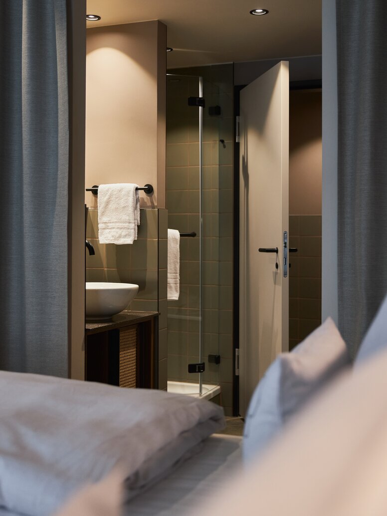 « Notre objectif est aussi bien l'esthétique que la conformité aux normes et l'accessibilité à tous », souligne Antonia Wileschek, chef de produit Design chez HEWI. De plus, pour cet hôtel Cocoon, Dreimeta a choisi la tringle à rideau avec suspension au plafond de la série classique HEWI 477/801. La main courante de douche avec barre avec coulisseau de douche fait partie de la série 805 qui, comme la série 477/801, repose sur un design tubulaire rond. « Les produits HEWI permettent d'aménager les chambres et les salles de bain accessibles à tous de manière aussi esthétique et confortable que les autres zones », souligne l'architecte d'intérieur Andrea Kraft-Hammerschall.