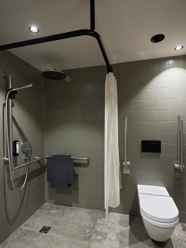 Outre les poignées de porte, des systèmes HEWI sont également utilisés dans les salles de bain accessibles à tous de l’hôtel Cocoon de Salzbourg. Depuis des décennies, HEWI est considéré comme le spécialiste des solutions adaptées aux personnes handicapées et développe toujours de nouveaux produits en se basant sur les principes du design universel. Dans les salles de bain de l’hôtel Cocoon, des solutions telles que la barre d'appui relevable et le siège de douche suspendu particulièrement léger du système 900 permettent aux clients de l'hôtel présentant un handicap physique d’utiliser plus facilement cet espace. Tous les systèmes HEWI pour les salles de bain adaptées aux personnes handicapées se distinguent par leur fonctionnalité, leur haute qualité et leur conception hygiénique et facile à entretenir.