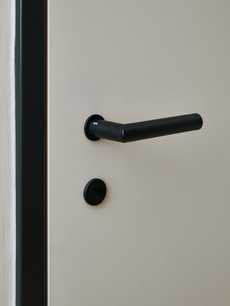 En édition mate, la série 162 HEWI séduit par son aspect caractéristique avec une surface particulièrement élégante qui convainc au toucher et qui a un aspect très luxueux. La finition veloutée est obtenue grâce à un procédé spécial au cours duquel les produits en polyamide sont sablés individuellement à la main avec des billes de verre. La variante mini choisie pour l’hôtel Cocoon est particulièrement élégante avec sa petite rosace de clé combinée.