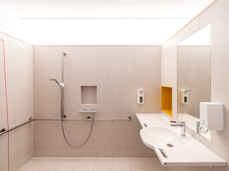 « Avec HEWI, nous avons pu planifier nos salles de bain de manière individuelle », déclare Stefan Hiebeler. Les salles de bain réaménagées favorisent le bien-être des patients tout en soulageant le personnel soignant, en permettant l’autonomie et en offrant de la sécurité.