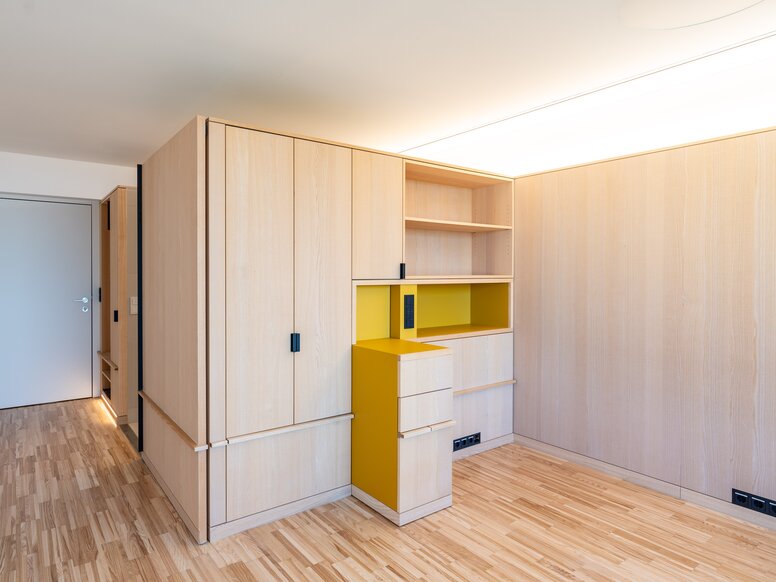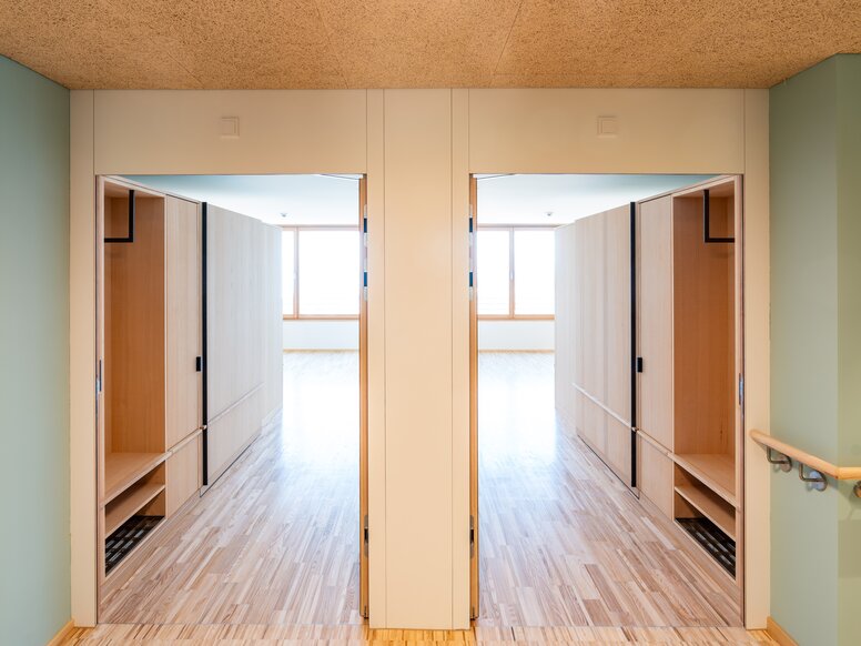 Les murs, les meubles et les sols en bois ainsi que des touches de couleur fraîches créent une atmosphère confortable dans le nouveau bâtiment « Haus Pfänder ». Les aménagements en bois ont été conçus de manière extrêmement modulable, certains éléments pouvant être sortis ou rentrés.