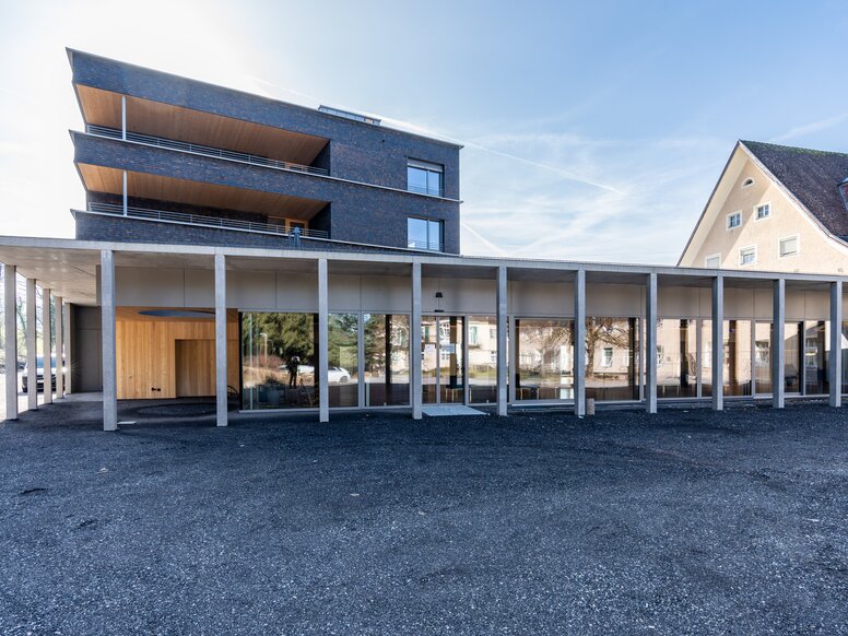 Après la démolition du bâtiment des années 1980, la nouvelle aile « Haus Pfänder » a été construite au même endroit au sud de l’ensemble de bâtiments, d’abord comme un bâtiment à deux étages avec une structure porteuse en béton. Une fois les deux étages terminés, les résidents ont été transférés de l’extension temporaire vers le nouveau bâtiment. Enfin, les 36 modules en bois ont été déménagés. Ces modules ont été placés sur le nouveau bâtiment pour former le 2e étage et le 3e étage et ont ainsi été réutilisés sur place. En seulement quatre jours, les modules ont été transportés l’un après l’autre à l’aide d’une grue et de deux camions. L’architecture épurée du nouveau bâtiment se caractérise par des lignes droites, de grandes fenêtres et une façade moderne en bois foncé, et contraste délibérément avec le bâtiment principal historique. Sur quatre étages, de vastes terrasses panoramiques ouvertes remplacent les petits balcons de l’ancien bâtiment. De grandes fenêtres laissent pénétrer la lumière du jour à l’intérieur et ouvrent la vue sur la belle nature.