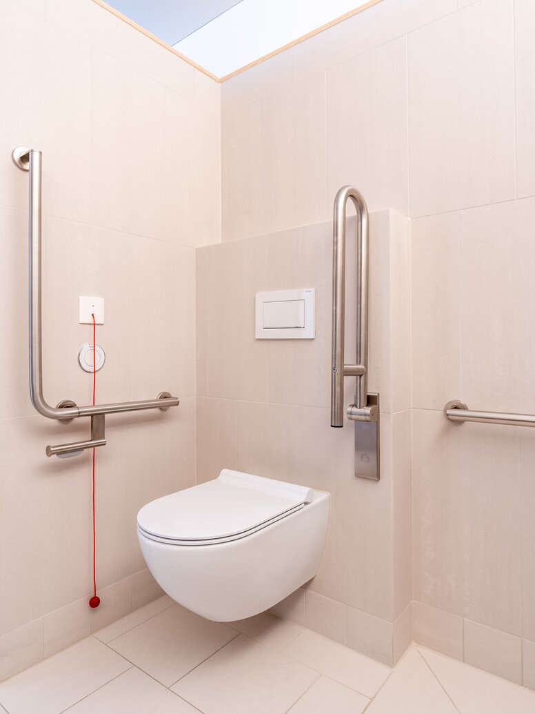 Les mains courantes de douche du système 900 HEWI en acier inoxydable et les poignées intelligemment intégrées aux lavabos permettent aux résidents de bénéficier d’un haut niveau de soutien et de sécurité et les aident ainsi à conserver leur autonomie.