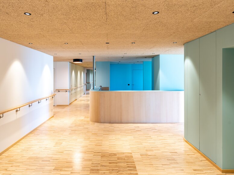 Les espaces intérieurs du nouveau bâtiment « Haus Pfänder » sont lumineux et conviviaux et présentent un mélange équilibré de couleurs, de lumière et de bois.