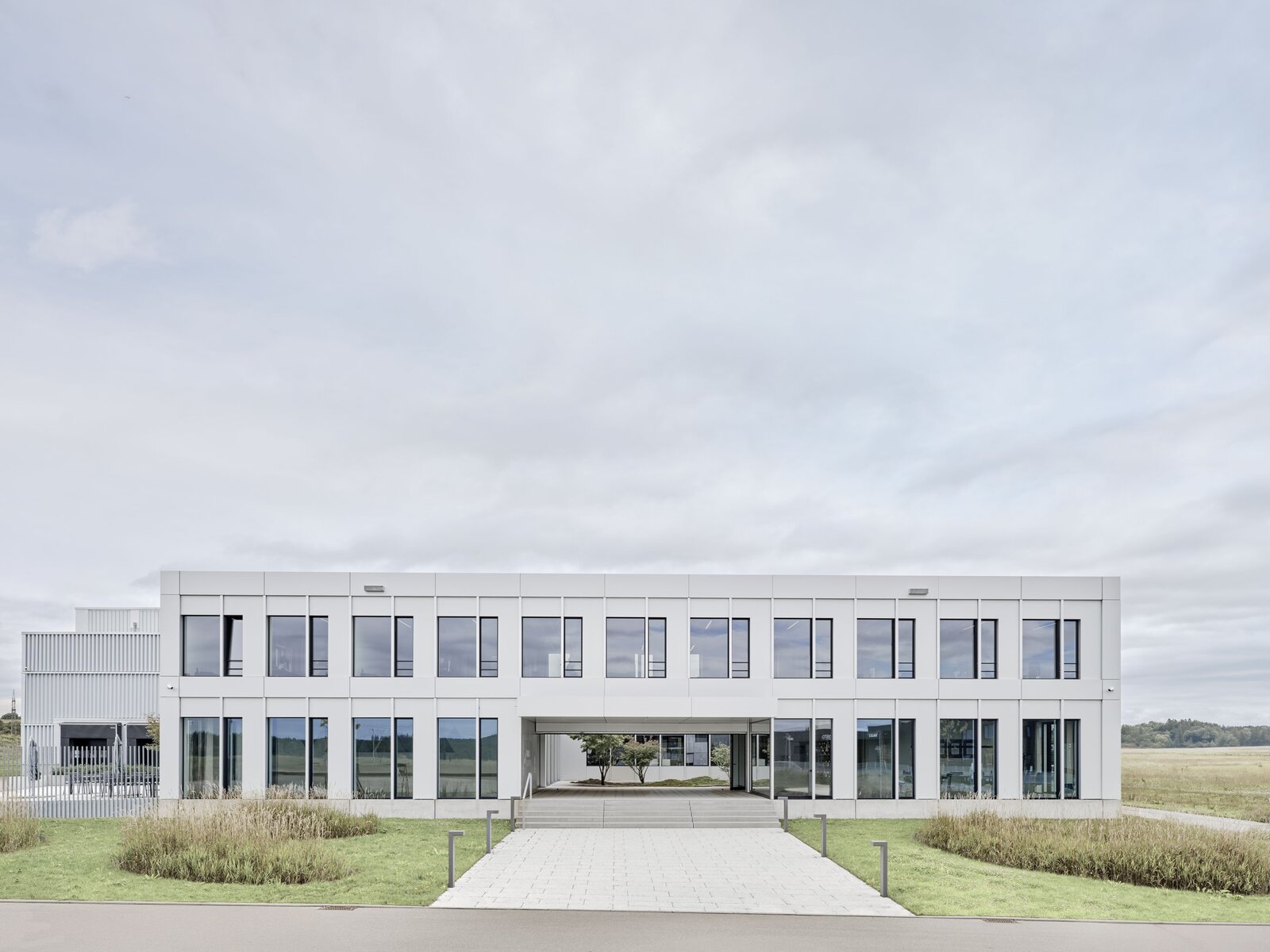 Les différentes affectations à l’intérieur sont directement lisibles de l’extérieur. Tandis que le hall de production est pourvu d’une enveloppe en tôle d’acier trapézoïdale rythmée par un jeu de reliefs profonds en saillie et en retrait et disposée en strates horizontales, lui conférant une apparence presque textile, le bâtiment administratif lui oppose un contraste affirmé. Revêtu de plaques d’aluminium, il apparaît lisse et calme, et la partie du bâtiment ainsi aménagée plutôt monolithique.