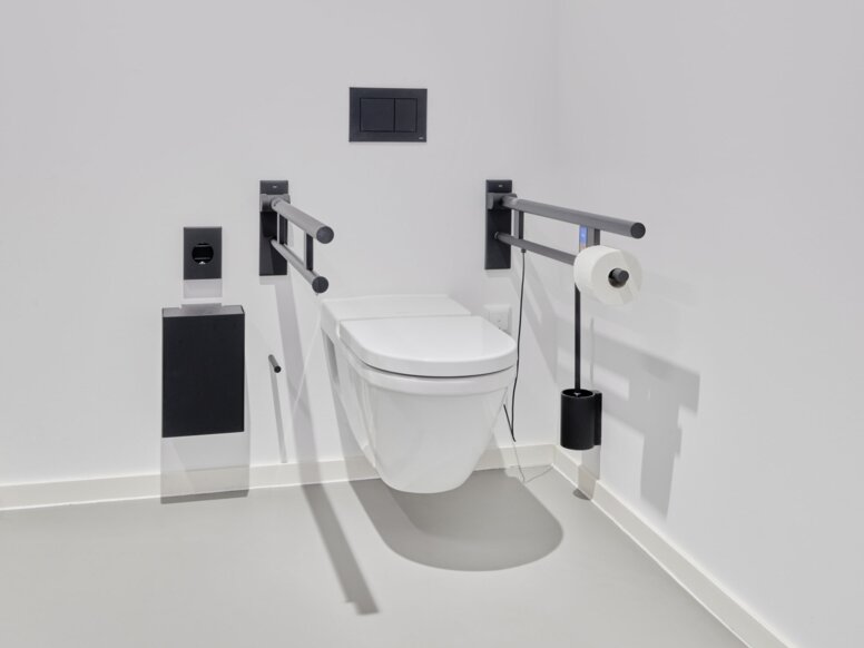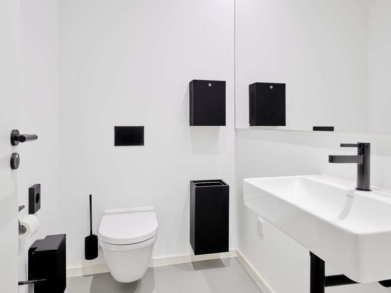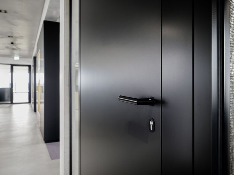 Concrètement, le choix s’est porté sur la série classique HEWI S 111, le système 900 avec des produits pour les espaces sanitaires, et la série S 162 avec son design rectiligne et épuré. Les concepteurs ont équipé de manière cohérente le hall d’usine et les zones de production correspondantes de produits en acier inoxydable brossé mat. Dans le bâtiment administratif, seuls des modèles en noir mat profond ont été utilisés, notamment des produits revêtus par poudre et des garnitures de portes en polyamide robuste.