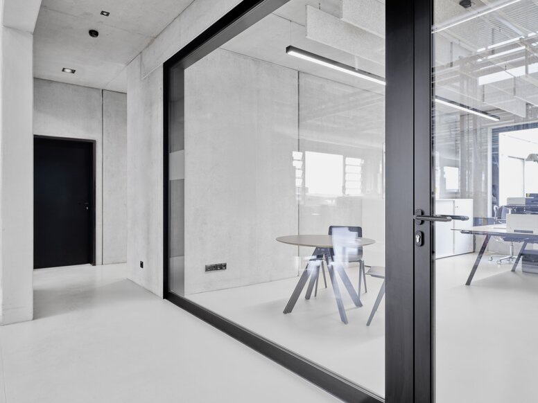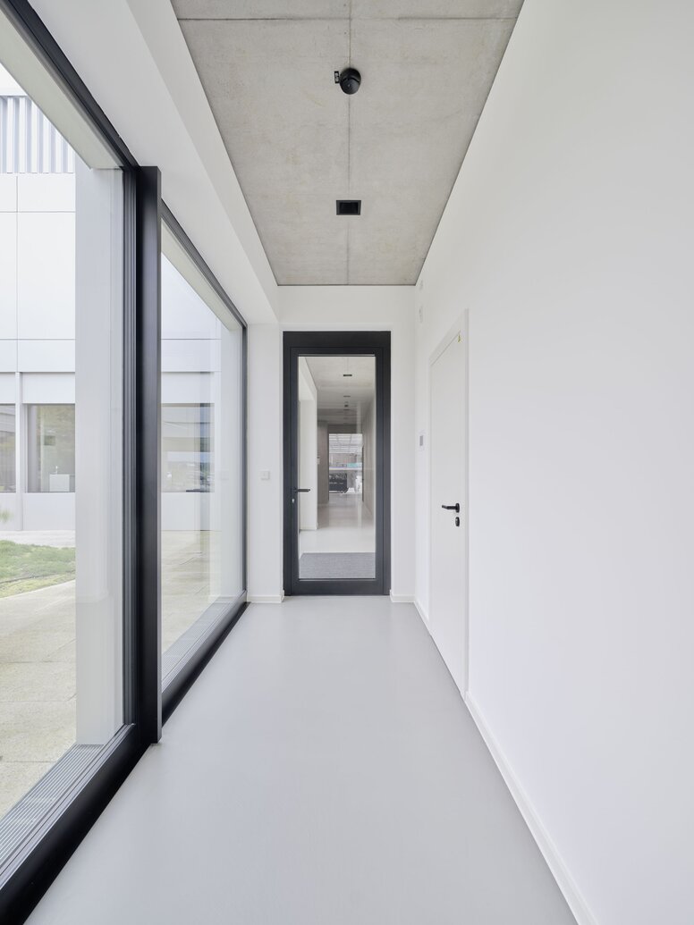 À l’intérieur, les architectes ont mis en œuvre des principes de design épurés de manière totalement cohérente. Ainsi, l’ensemble du hall de production rayonne d’un blanc presque sacré. « Nous avons même fait peindre la grue de chargement en blanc », raconte l’architecte Prof. Alexandra Röing genannt Nölke, avant de poursuivre : « C’est tout à fait consciemment que nous avons choisi d’éviter l’aspect agité que l’on trouve habituellement dans les ateliers et les halls de production ». Les autres couleurs et matériaux apportent également de la clarté. Le blanc caractérise la surface de production, les surfaces en béton apparent et les éléments noirs donnent à l’aile administrative un visage uniforme, d’une élégance discrète.