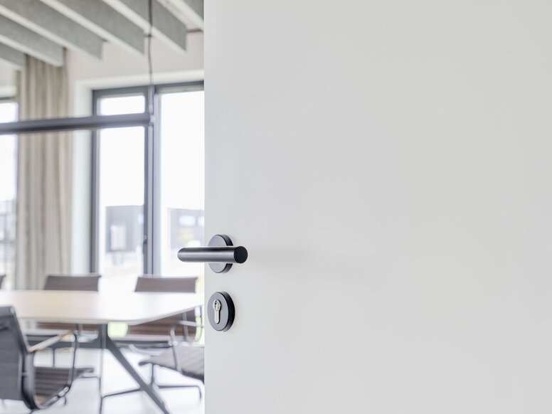Pour l’équipement du bâtiment, les architectes souhaitaient travailler avec la même cohérence et la même rigueur que pour l’ensemble de l’édifice. Pour cela, HEWI leur a proposé une gamme de produits adaptée, qui convenait aussi bien à l’espace bureaux qu’au hall de production. « Nous avons été convaincus par les formes uniformes et esthétiques des produits », rapporte Alexandra Röing genannt Nölke. « Le fait que la société HEWI produise en Allemagne a également été un argument pour nous intéresser de plus près à cette gamme de produits ». L’architecte y a trouvé une diversité convaincante qui, outre les poignées de portes et les poignées de fenêtres au look iconique, comprenait également une gamme complète d’accessoires sanitaires. Et ce, dans des qualités qui apportaient à la fois la robustesse nécessaire au secteur de la production et l’élégance attendue dans les bâtiments administratifs. La décision d’utiliser exclusivement des produits HEWI a été prise rapidement.