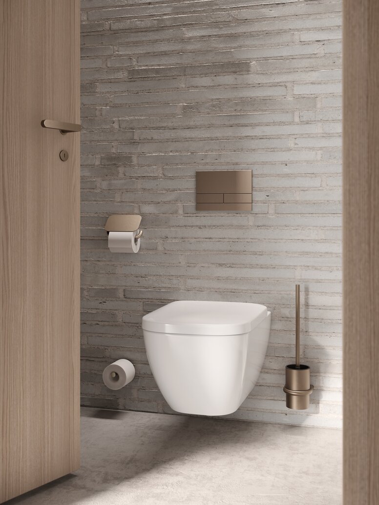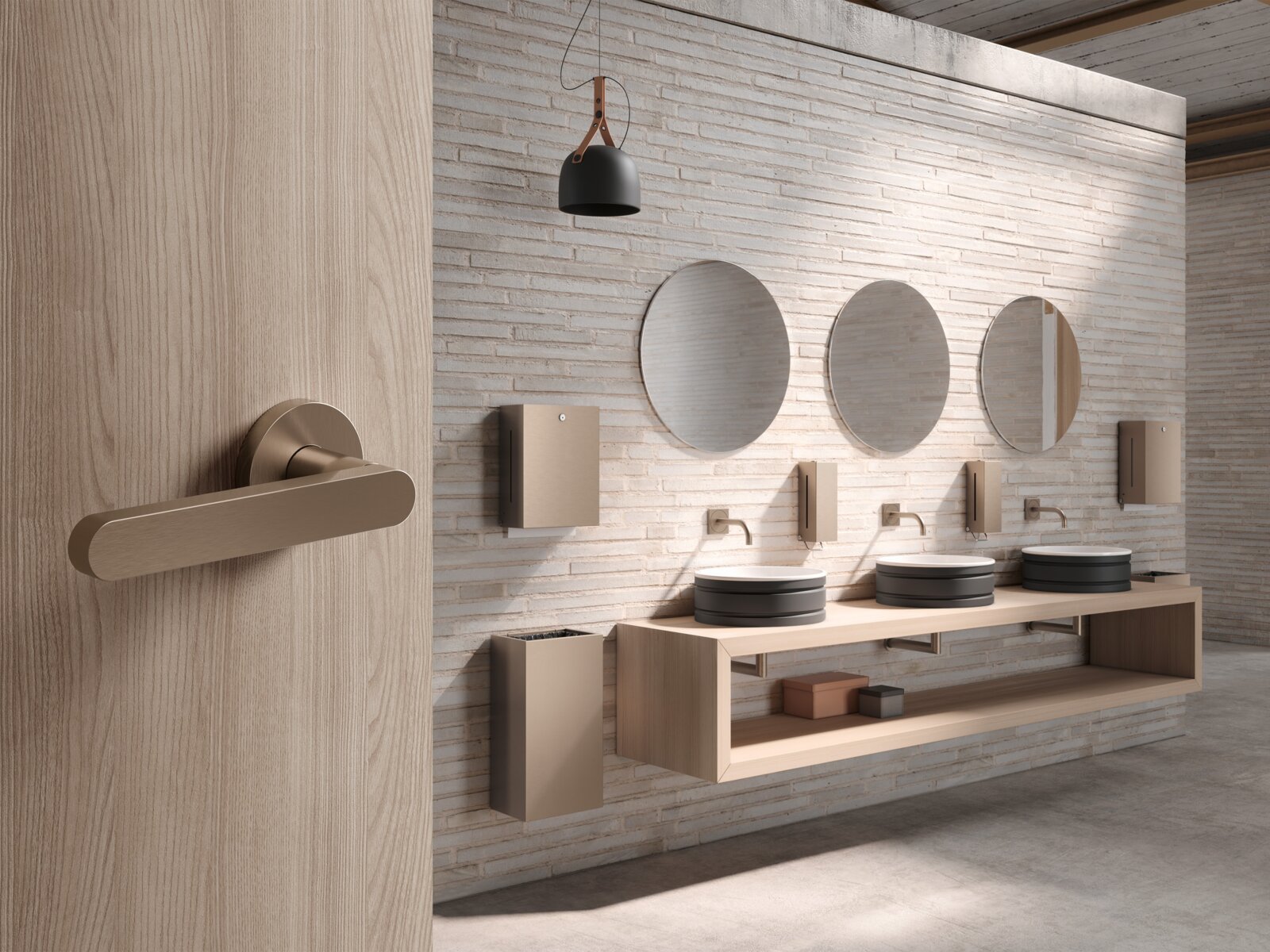 HEWI propose cette nouvelle palette de finitions en cinq couleurs harmonisées : laiton, nickel, or, bronze et cuivre. Ces teintes se marient parfaitement avec des matériaux tels que le bois, le verre ou le béton, offrant une grande liberté de conception.