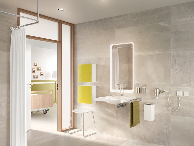 Les nouveaux lavabos HEWI avec poignées ergonomiques et bord surbaissé sont disponibles en deux tailles différentes. Vous pouvez choisir entre une niche de lavabo ronde ou rectangulaire. Le lavabo est disponible immédiatement avec un trou de robinet ou pour les robinets muraux