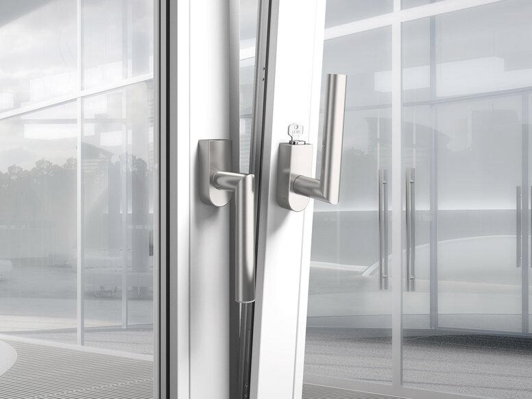 Les poignées de fenêtre HEWI pour le verrouillage permettent d'ouvrir la fenêtre uniquement avec une clé. En outre, des poignées de fenêtre verrouillables avec une fonction de basculement avant rotation sont disponibles en option. Lorsque la poignée de la fenêtre est verrouillée, elle libère la fenêtre pour qu'elle s'incline d'un tour de 90°. Le châssis de la fenêtre ne peut pas être complètement ouvert (tourné) lorsqu'il est verrouillé.