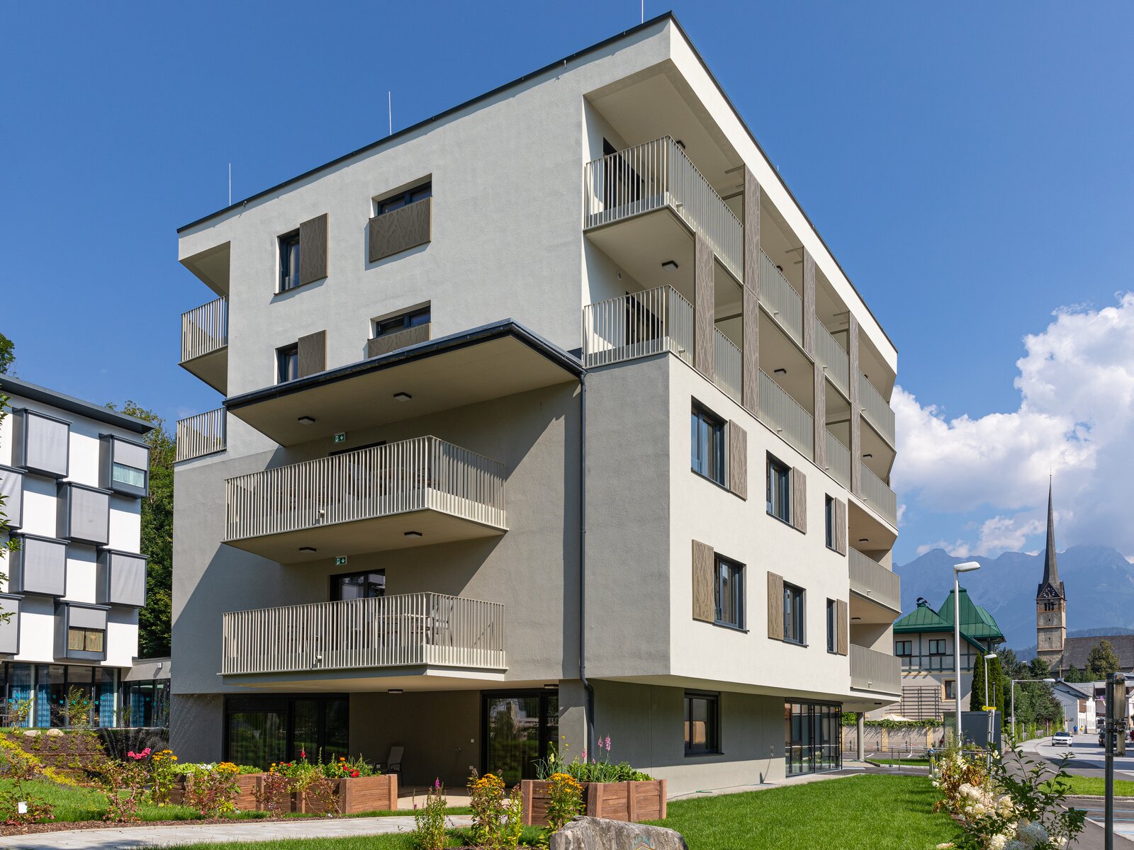 La maison de retraite de Bischofshofen se veut un lieu où l'on se sent chez soi. Là où les gens veulent vivre dans une communauté harmonieuse, la façade homogène du bâtiment reprend visuellement cette idée avec ses couleurs uniformes et son aspect de façade régulier.