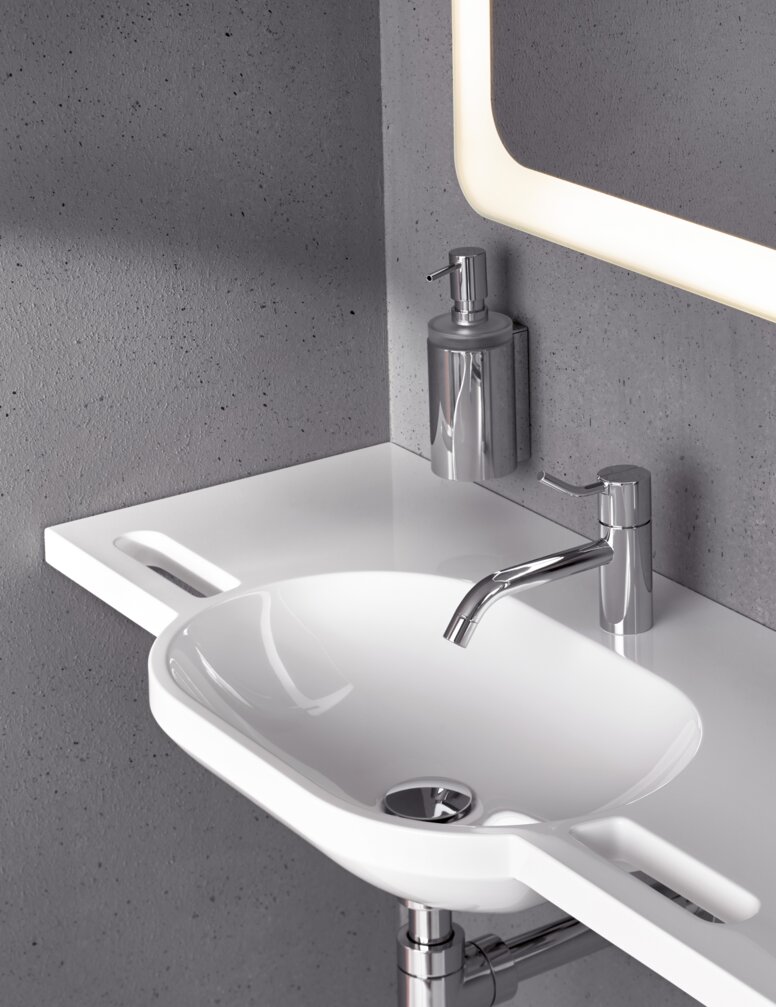 Deze wastafels combineren de verborgen greeprand  met ontwerp en functionaliteit. Dankzij de greeprand aan de voorzijde kunnen rolstoelgebruikers zich zelfstandig richting de wastafel trekken. Voor andere gebruikers biedt de greeprand een veilige houvast en dient hij indien nodig als hulpmiddel bij het vasthouden, zitten of opstaan. Deze wastafel heeft een hoogglanzend, niet-poreus oppervlak. Dit is gemakkelijk te reinigen, bijzonder onderhoudsvriendelijk en hygiënisch.