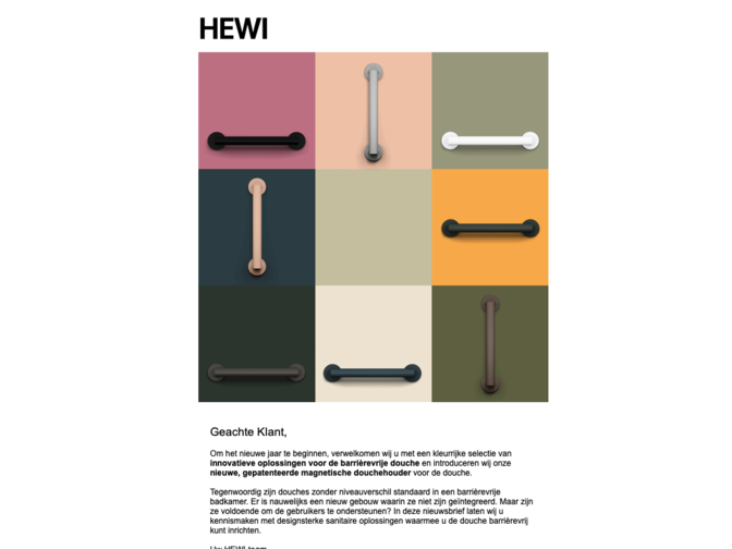 Met de HEWI Newsletter bent u altijd op de hoogte. Maandelijks informeren wij u over verschillende onderwerpen zoals nieuwe producten, technische wijzigingen, brochures en evenementen. Gebruik de HEWI Newsletter, om actuele informatie te verkrijgen en als inspiratie voor toekomstige projecten.
